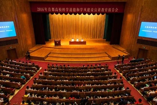 为深入贯彻落实习近平总书记在全国科技创新大会、两院院士大会和中国科协九大会议上的重要讲话精神,优化学术环境,弘扬学术道德和科研伦理,加强对青年学生和科技工作者的思想政治引领,由全国科学道德和学风建设宣讲教育领导小组与北京市科学道德和学风建设宣讲教育领导小组联合主办的2016年首都高校科学道德和学风建设宣讲教育报告会于9月20日在北京大学百年讲堂隆重举行。中国工程院副院长、第四军医大学西京消化病医院院长樊代明院士到会作宣讲报告。中国科协党组成员、书记处书记王春法代表全国宣讲教育领导小组致辞。北京市宣讲教育领导小组组长、市科协党组书记、常务副主席马林主持报告会。
