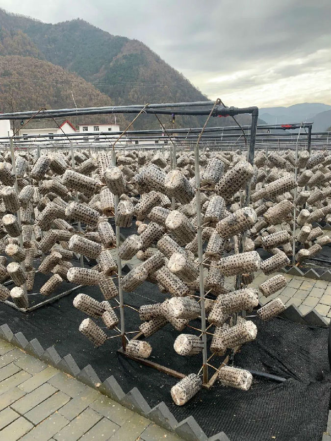 现代化的菌包棒,有的直接放在薄膜上,有的如糖葫芦插在钢筋棒上,有的则吊起来如连起来的小沙袋,待木耳长大盛开,个个便花团锦簇、精神抖擞、整装待发。
