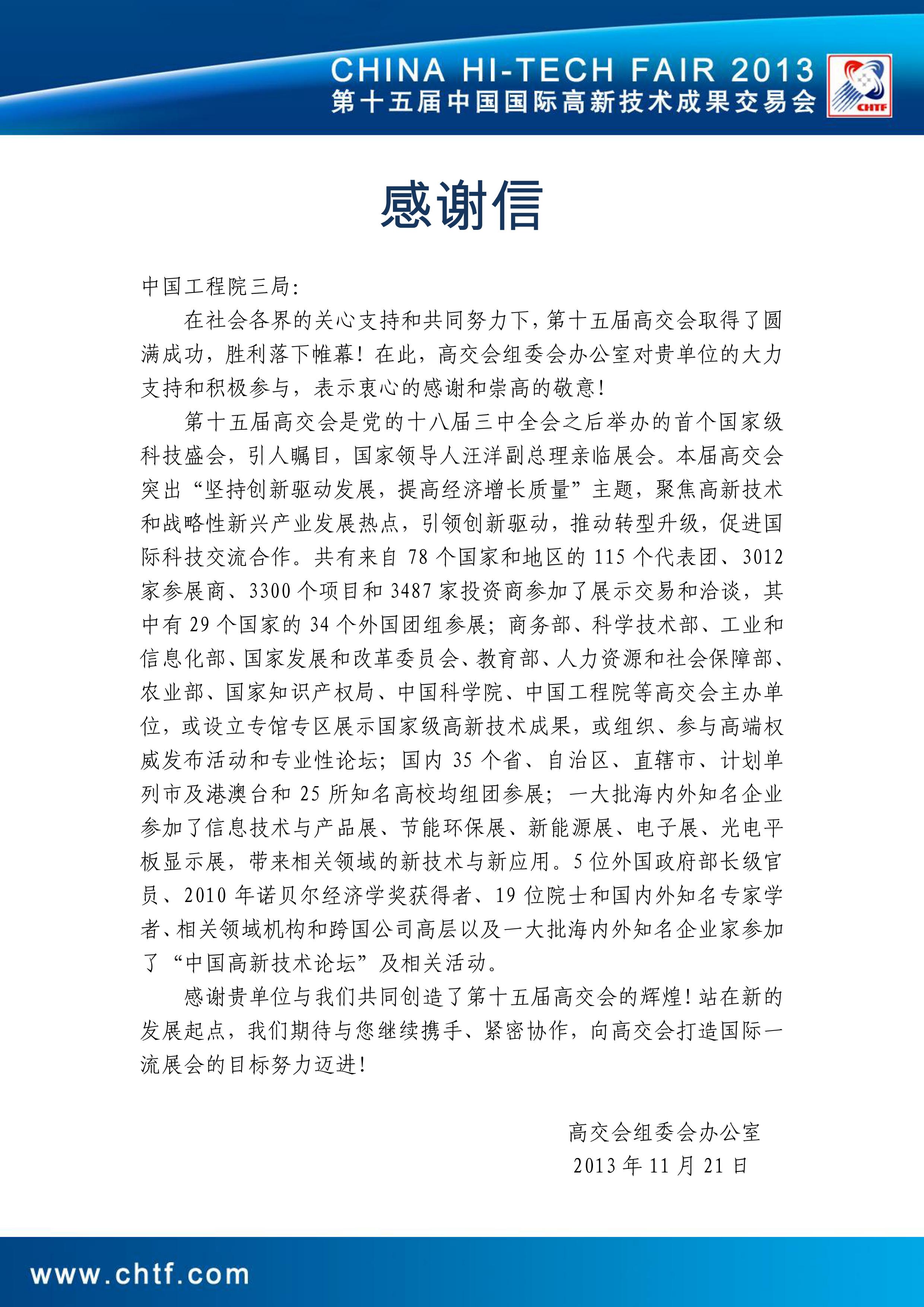 来自高交会组委会办公室的感谢信