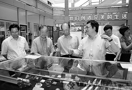 5月7日,中央人才工作协调小组成员王国栋院士、周克崧院士和王昭东教授来到广西南南铝加工有限公司,对该公司的生产建设进行了初步了解并提出建设性意见,希望南南铝业在完成既定目标的同时注重加强高新技术的投入和高级人才的培养。图为院士专家在参观高性能铝材成品。记者 唐典胜 摄