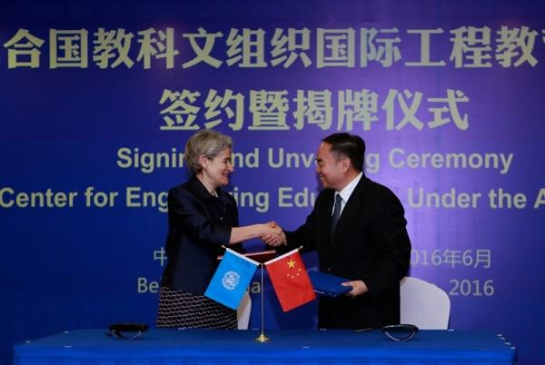 2016年6月6日上午,联合国教科文组织(UNESCO)国际工程教育中心签约暨揭牌仪式在北京饭店举行。UNESCO总干事博科娃女士(Irina Bokova)、中国工程院院长周济、清华大学校长邱勇、教育部原副部长吴启迪,UNESCO教育助理总干事唐虔、中国工程院党组成员赵宪庚、原常务副院长朱高峰,以及来自联合国教科文组织、中国工程院、教育部、清华大学、北京航空航天大学、浙江大学、钢铁研究总院等部门和单位的90余名代表出席仪式。