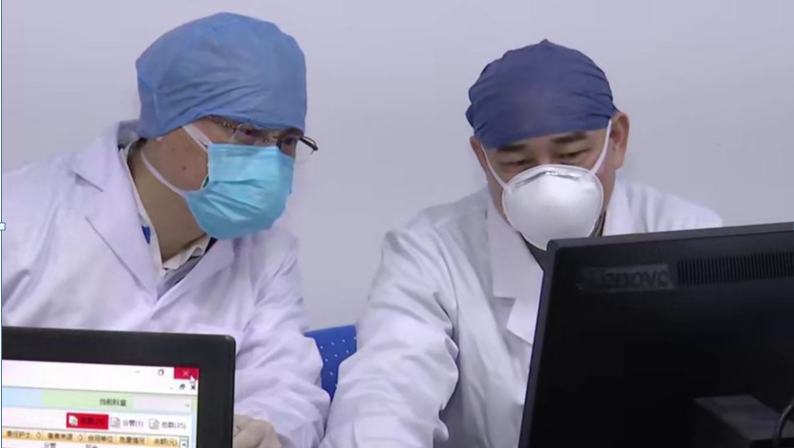 黄璐琦院士(左)在金银潭医院南一病区指导工作