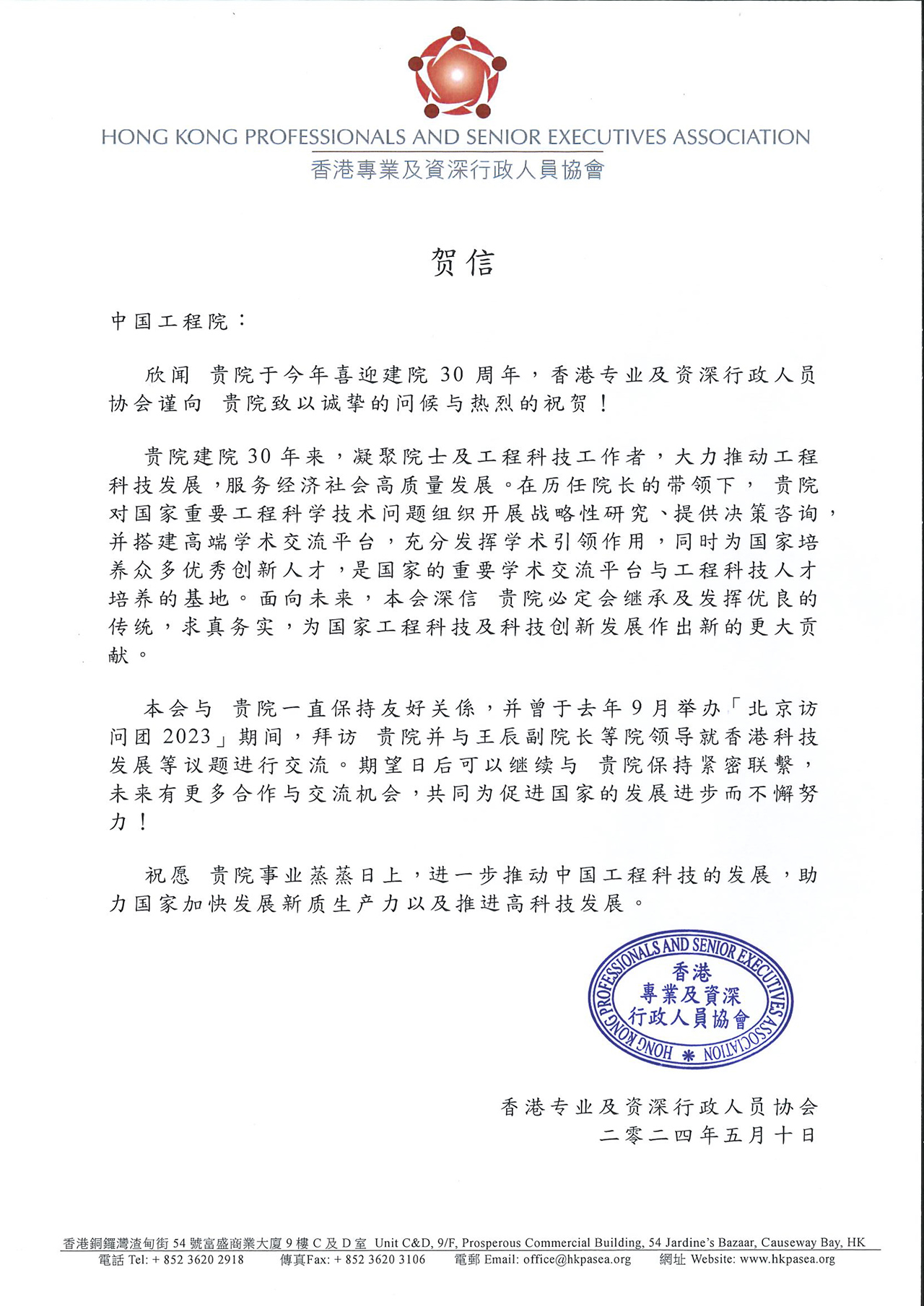 香港专业及资深行政人员协会贺信