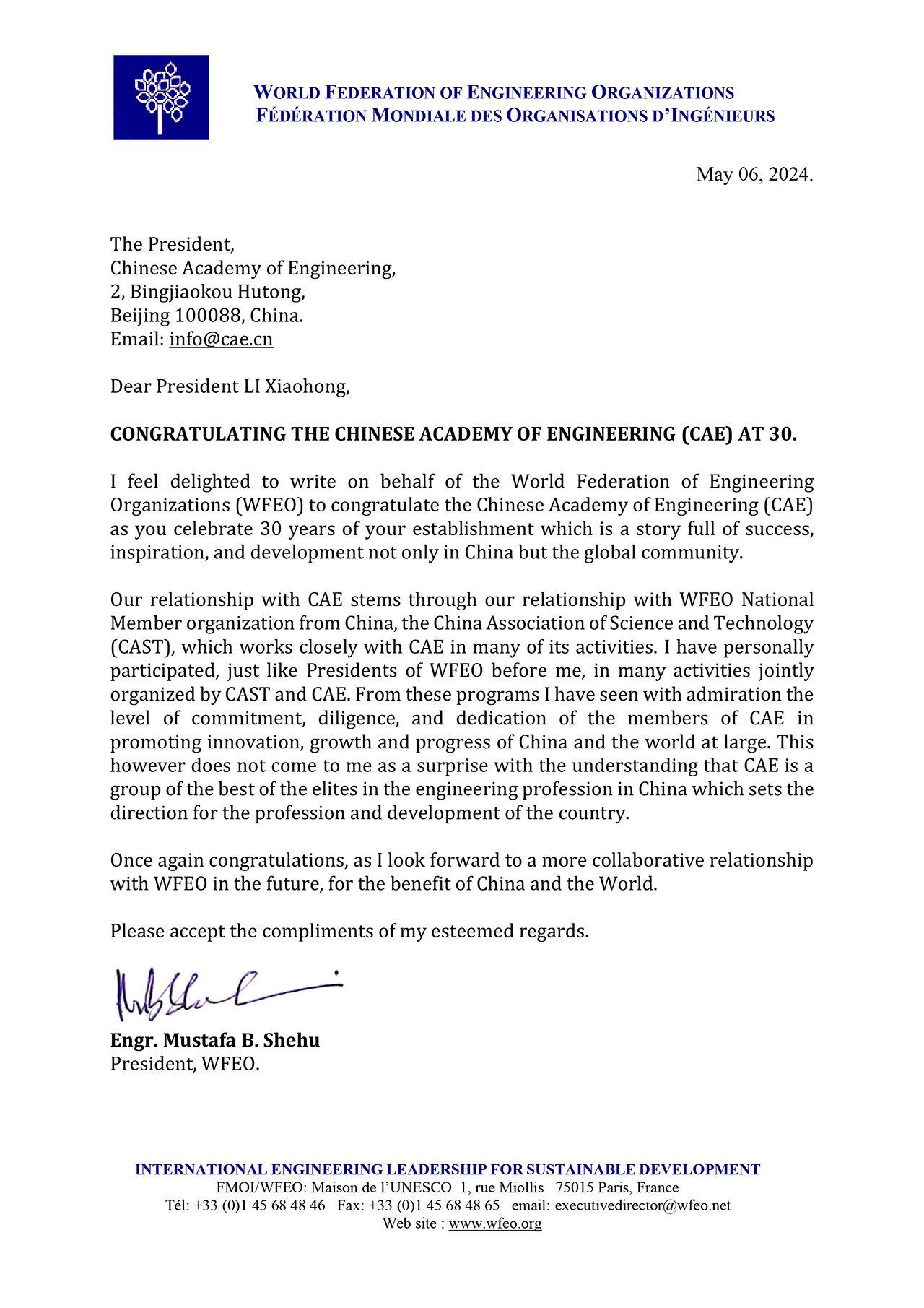 世界工程组织联合会(WFEO)贺信