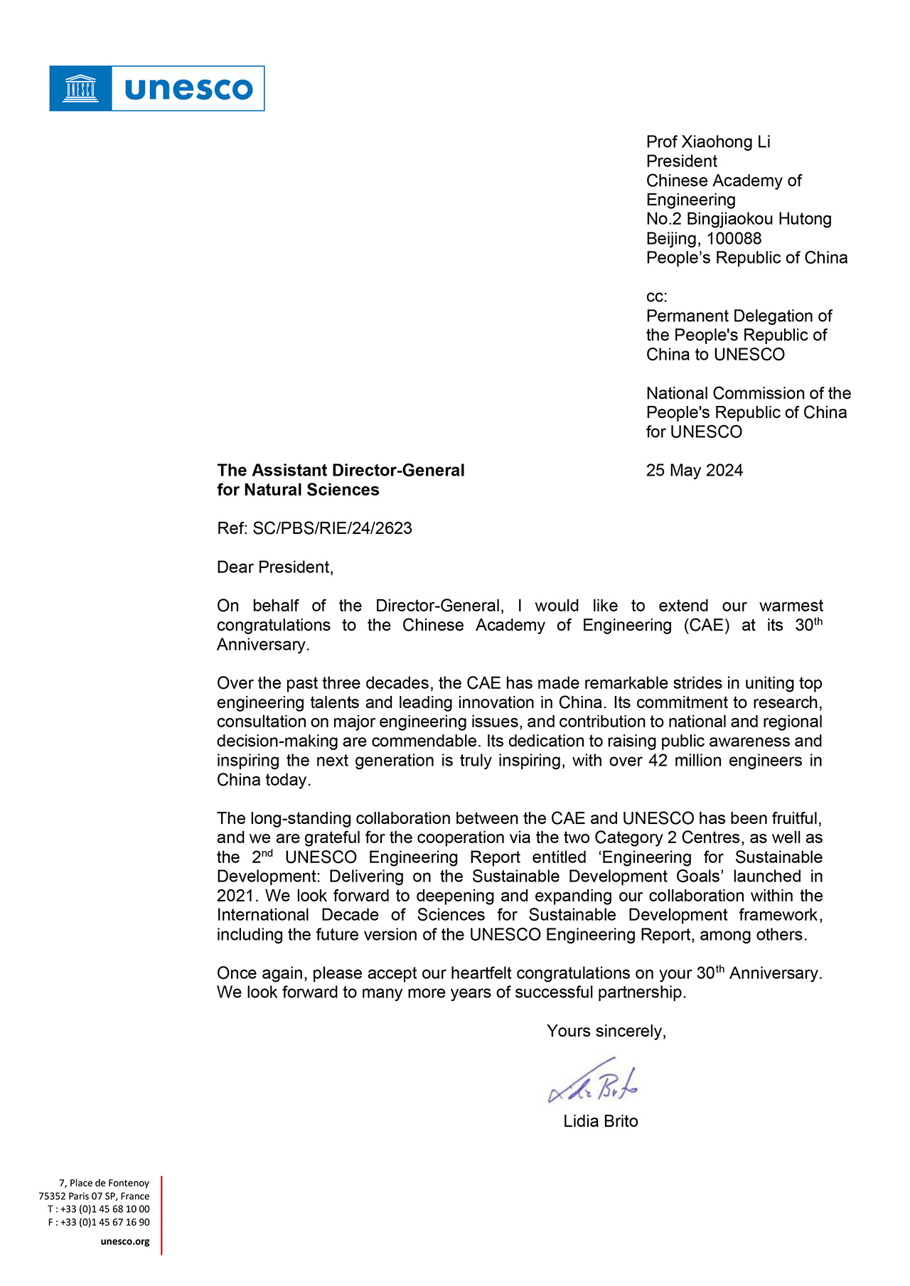 联合国教科文组织(UNESCO)贺信