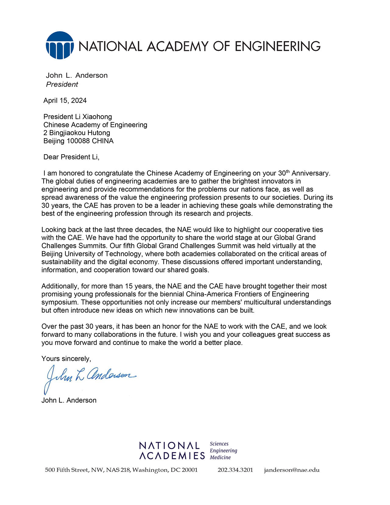 美国国家工程院贺信