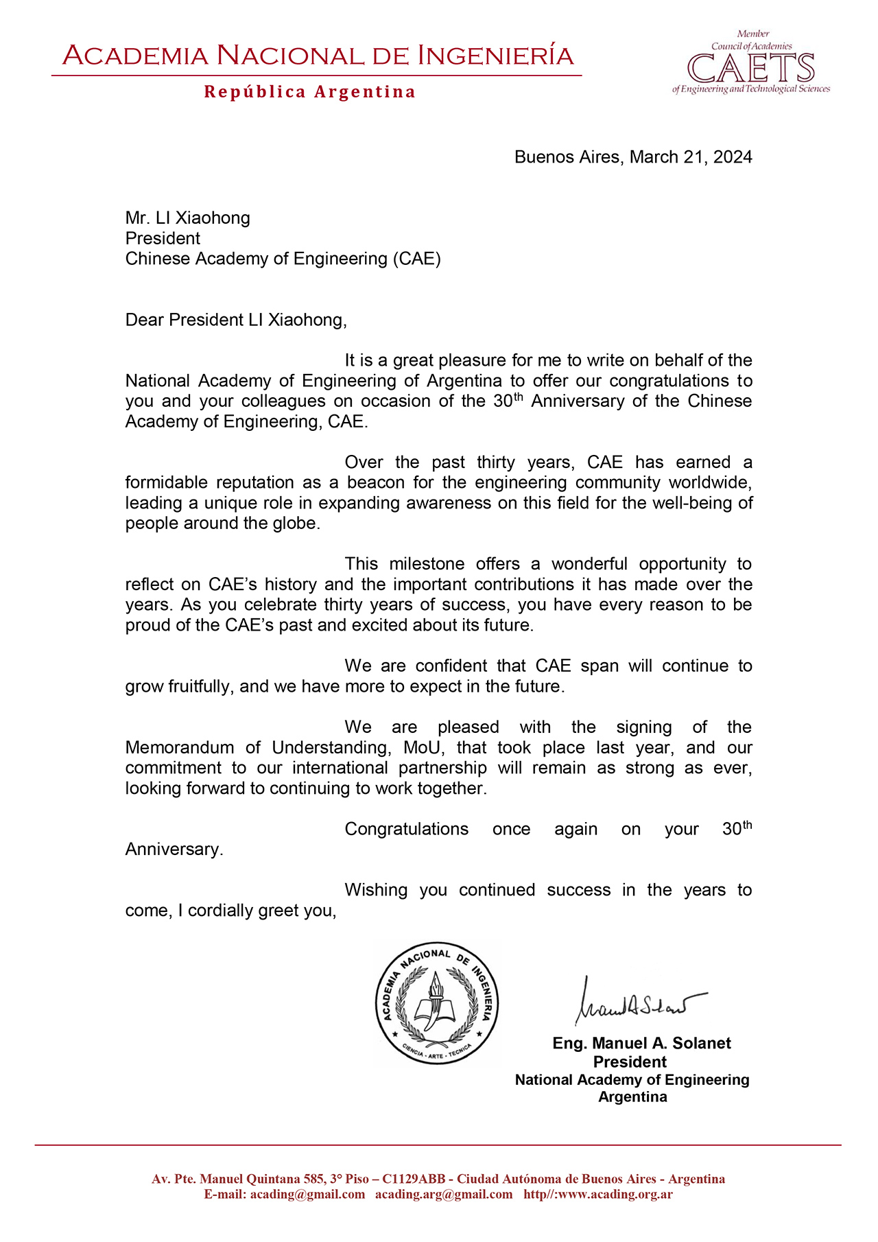 阿根廷国家工程院贺信