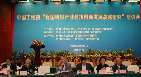 12月5-6日,由中国工程院环境与轻纺工程学部、福建省科学技术协会联合主办,东华大学、泉州海天材料科技股份有限公司共同承办的“我国纺织产业科技创新发展战略研究”研讨会在福建泉州举行。蒋士成、周翔、郁铭芳、姚穆等院士以及来自国家相关部委、行业协会、研究院校和企业的80余位专家及代表出席了会议。