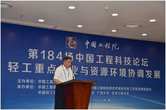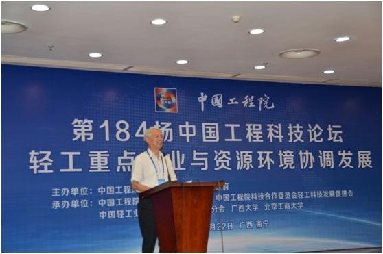 2014年8月22-23日,由中国工程院、广西壮族自治区人民政府主办,中国工程院环境与轻纺工程学部、中国工程院科技合作委员会轻工科技发展促进会、中国轻工业联合会科技发展研究分会、广西大学、北京工商大学共同承办的第184场中国工程科技论坛“轻工科技发展论坛――轻工重点行业与资源环境协调发展”在广西南宁召开。工程院徐德龙副院长、广西壮族自治区人民政府黄日波副主席、广西壮族自治区人民政府陈幸良副秘书长、工程院二局王元晶副巡视员,工程院环境与轻纺工程学部陈克复、孙宝国、石碧、谢剑平、朱蓓薇等5位院士,以及来自相关高校、科研院所、行业协会、企业以及政府相关职能部门的220余名代表参加了本次论坛。陈克复院士担任本次论坛大会主席,孙宝国院士主持开幕式。