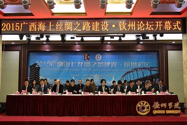 12月19日,由中国工程院环境与轻纺工程学部,钦州市委、市政府,钦州学院共同主办的2015广西海上丝绸之路建设•钦州论坛在广西钦州市开幕。此次论坛以“海上丝绸之路和海洋生态文明建设”为主题,探讨海上丝绸之路与互联互通。中国工程院院士丁德文、中国科学院院士王颖、钦州市市长唐琮沅、广西自治区教育厅副厅长蔡昌卓、中国工程院二局副巡视员梁晓捷、国家海洋局第三海洋研究所所长余兴光、钦州学院党委书记赵君等领导出席论坛开幕式,相关行业领导及来自我国海洋领域的专家、学者共计200余人与会。