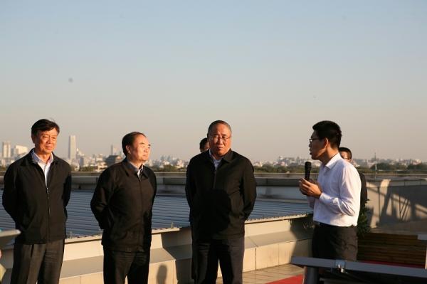 汇报会后,周济院长、干勇副院长陪同考察人员实地参观了节能科技楼建设情况。解振华等领导先后来到雨水收集系统、中水回收处理系统、餐厨垃圾处理系统实地查看系统运转情况;在听取新奥集团承担的能效管理平台建设情况汇报时,解振华等领导对四梯级加热、余能回收和智能控制等集成创新节能技术在优化节能方面的应用与技术人员进行了详细交流。解振华一行还登上大楼楼顶考察了由新奥集团、英利集团、中轻太阳能电池有限责任公司和四季沐歌等单位建设的太阳能光电、光热系统,仔细询问不同类型太阳能电池光能转化效率、使用寿命、投资效益等问题。