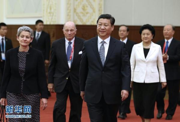 这是会议开始前,习近平会见联合国教科文组织总干事博科娃、国际工程与技术科学院理事会秘书长萨尔曼等与会外方代表。 新华社记者 兰红光摄
