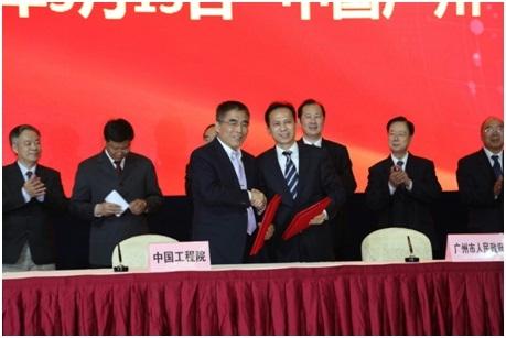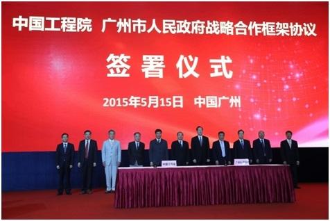 5月15日下午,中国工程院与广州市人民政府战略合作框架协议签署仪式在广州举行。中国工程院院长周济,副院长徐德龙,孙永福、周福霖、郝吉明、朱高峰、殷瑞钰、傅志寰、何继善、刘人怀、郭重庆、翟光明、胡文瑞、汪应洛、张寿荣、钟南山、孟伟、瞿金平、周克崧、孙玉、罗绍基、李立浧、张偲、陈勇等院士,广州市委书记任学锋,市长陈建华、副市长周亚伟等出席签署仪式。周济院长、陈建华市长分别致辞,徐德龙副院长、周亚伟副市长代表双方在合作协议上签字。