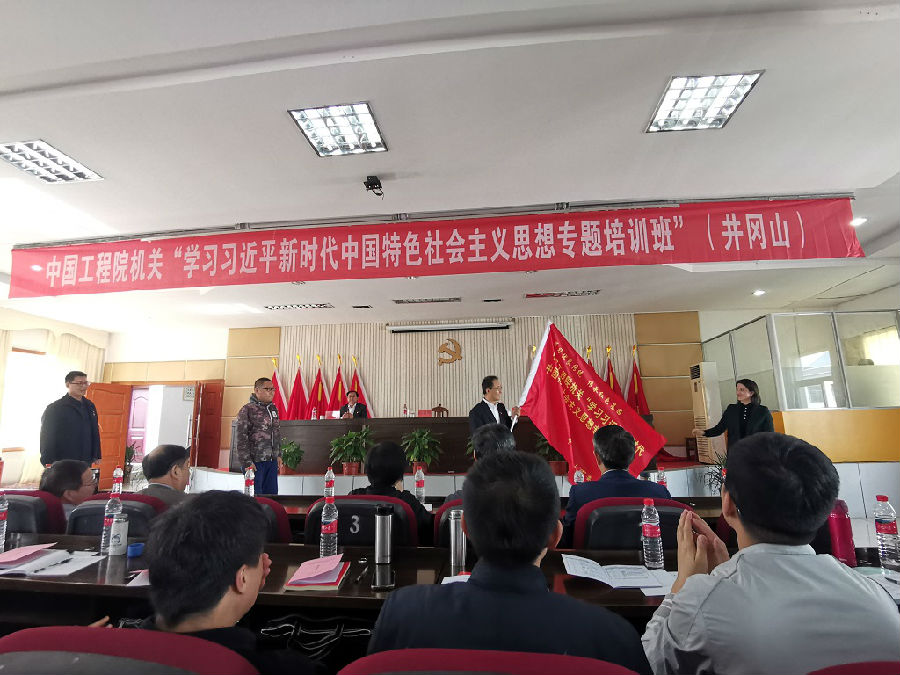 2019年4月16日下午,中国工程院机关“学习习近平新时代中国特色社会主义思想”专题培训班在井冈山市委党校举行了开班仪式。井冈山市委党校常务副校长雷兆文主持开班式,井冈山市委副书记、井冈山市委党校校长杨春霞,工程院党组成员、机关党委书记、秘书长陈建峰出席会议并讲话。中国工程院机关和战略咨询中心50多位党员干部参加此次培训并面向班旗庄严宣誓。