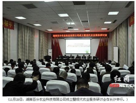 今天,湖南百分农业科技有限公司成立暨现代农业服务研讨会在长沙举行。研讨会上,一项由种业公司牵头发起的农业生产技术服务悄然兴起,杂交水稻之父袁隆平再次成为湖南以技术装备现代农民的推动者。