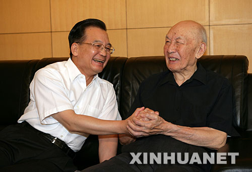 2007年8月3日,中共中央政治局常委、国务院总理温家宝来到著名物理学家朱光亚家,看望这位曾经在我国原子弹、氢弹研制中有过突出贡献的“两弹一星”功勋奖章获得者。 新华社记者 黄敬文摄