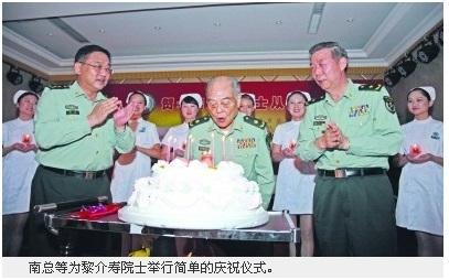 庆祝活动中,由南京军区副政委吴刚代表南京军区司令员蔡英挺、政委郑卫平宣读了贺信。南京军区、南京军区联勤部、南京总医院领导分别向老院士赠送了“从医七十周年”纪念品,黎介寿院士谈了从医70年感悟。