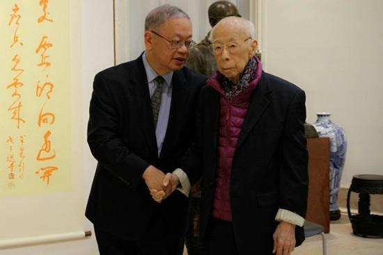 香港大学饶宗颐学术馆馆长李焯芬(左)与著名国学大师饶宗颐先生