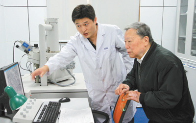 资料图片:陈清如院士(右)在指导实验。