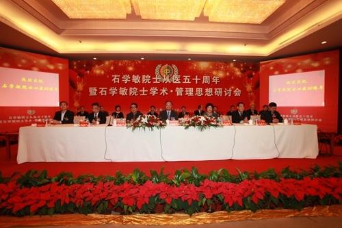 2012年10月14日,天津中医药大学第一附属医院在天津市迎宾馆隆重举办了石学敏院士从医50周年学术•管理思想研讨会。卫生部副部长、国家中医药管理局局长王国强,中共天津市委常委、教育工委书记朱丽萍,天津市卫生局党委书记、局长王贺胜,中国工程院院士、中国中医科学院院长、天津中医药大学校长张伯礼,中国中医科学院副院长、中国针灸学会会长刘保延,成都中医药大学副校长梁繁荣,德国学者弗洛里安先后致辞祝贺。天津市人大副主任苟利军发来贺信。全国政协常委、农工民主党中央副主席、中华中医药学会副会长、天津市中医药学会会长张大宁,国家中医药管理局医政司司长许志仁,国家中医药管理局科教司副司长李昱,国家自然科学基金委员会八处主任王昌恩以及天津市科委、教委、卫生局、药监局、市委办公厅、科协、天津中医药大学等单位的领导同志和德国中国传统医学研究院院长迪•顾•库莫尔等来自海内外的300余位嘉宾出席了研讨会,共同向天津中医药大学第一附属医院(以下简称一附院)名誉院长石学敏院士从医50年来为祖国中医药事业发展做出的贡献和取得的成就表示祝贺。