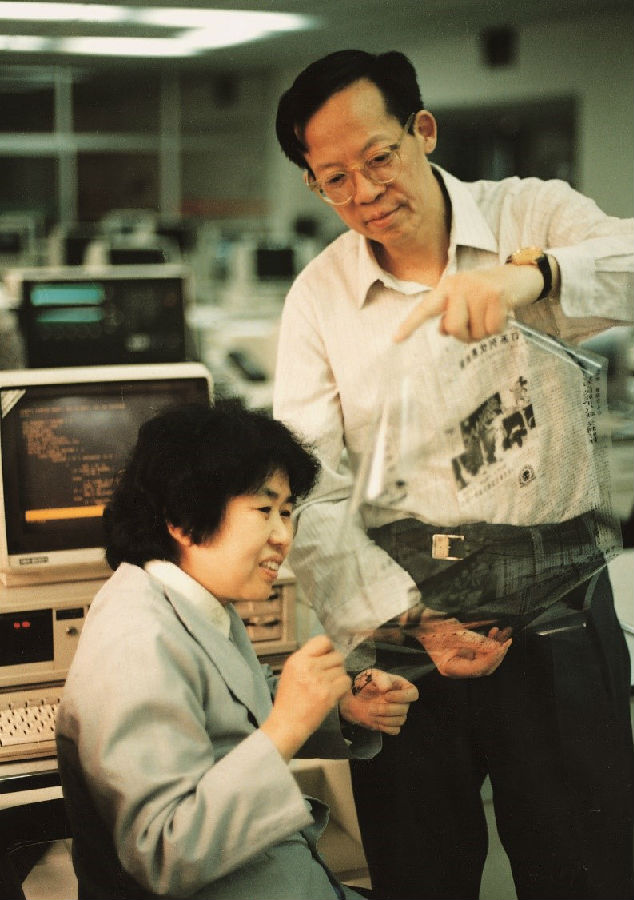 王选和夫人陈堃銶在查看用汉字激光照排系统输出的报纸胶片