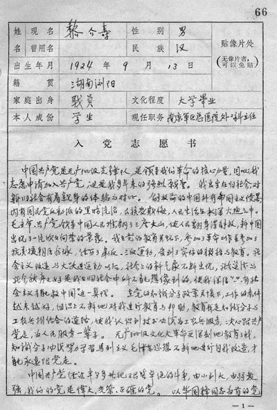 在他的第27封入党申请书中,黎介寿一如既往,像捍卫生命一样捍卫着自己的信仰:“现在我虽然已54岁,但年龄不能阻挡我朝‘又红又专’的方向前进,更不能阻挡我为党更好地工作。我渴望在以后的岁月里,在党组织的直接监督教育下,努力改造世界观,为人民做更多的工作……”