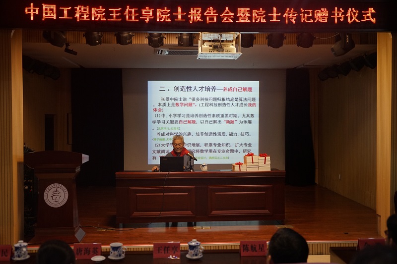 两场报告会上,王任享院士以“我的科研生涯以数学取胜”为题,向师生们介绍了他的学习和科研工作体会并简要介绍了卫星定位和卫星摄影测量的知识。他在报告中指出,中小学阶段是培养创造性素质的重要时期,鼓励同学们要多进行“创造性劳动”,培养创新精神。他以数学学习为例,指出学习的关键是要养成“自己解题”的好习惯,以自己解出“难题”为乐趣,养成对科学的兴趣,培养创造性素质、能力、技巧。他以“为天下人谋永福”寄语同学们,希望同学们弘扬科学精神,自强不息,为国争光,为人民谋永福。报告结束后,王任享院士还耐心回答了同学们的提问,并与大家分享了他的科研格言:求真、务实、创新、担当。