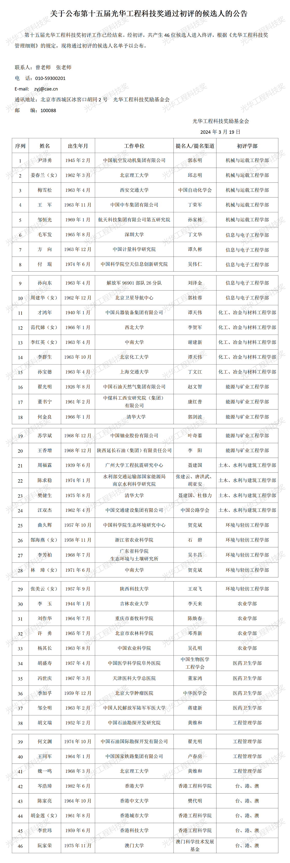 关于公布第十五届光华工程科技奖通过初评的候选人的公告