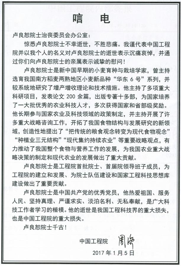 惊悉卢良恕院士不幸逝世,不胜悲痛。我谨代表中国工程院并以我个人的名义对卢良恕院士的逝世表示沉痛哀悼,并通过你们向卢良恕院士的亲属表示诚挚的慰问!