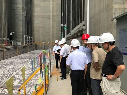 9月8日下午,项目组赴三峡枢纽管理局,对三峡船闸、升船机及新通道进行了现场调研。三峡升船机是三峡水利枢纽的永久通航设施之一,布置在枢纽左岸,位于双线五级船闸右侧,由上游引航道、上闸首、船厢室段、下闸首和下游引航道等部分组成。其主要作用是为客、货轮提供快速过坝通道,并与双线五级船闸联合运行,提高枢纽的航运通过能力,保障枢纽通航的质量。三峡升船机采用齿轮齿条爬升平衡重式垂直升船机,其过船规模为3000t级,最大提升高度113m。具有提升高度大、提升重量大、上游通航水位变幅大、下游水位变化速率快的特点,是目前世界上技术难度和规模最大的升船机。