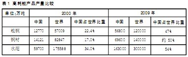 表1为2000年与2009年几种高能耗产品产量对比。由表中可知,我国高能耗产业已进入饱和期,可以满足相当大规模的基本建设需求。现有产能可满足每年完成25亿~30亿平方米建筑竣工面积、10万公里公路、7000公里高速公路、6000公里铁路、1500公里高速铁路和改建新建20个机场,已经超出合理建设规模的需求。同时,建筑节能、交通节能等领域节能潜力明显。三大产业结构调整节能潜力大。高能耗产业不应也不可能持续高速增长。