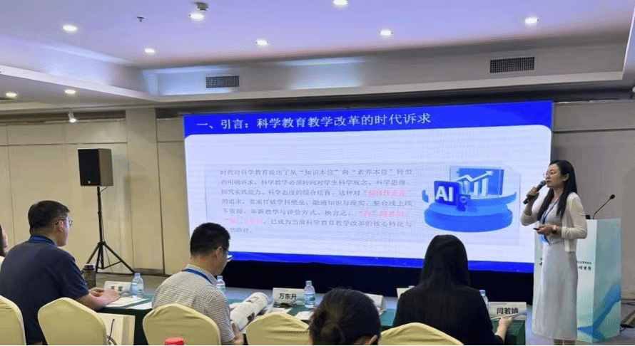 在大会分论坛报告环节,齐鲁师范学院教师教育学院伊娟博士以《科学教育教学改革的“跨”与“融”》为题作会议发言。伊娟博士系统阐释了当前科学教育教学改革面临的知识碎片化、教学范式固化及评价方式单一等现实困境。在此背景下,她提出以“跨”与“融”作为推动科学教育教学改革的破局之钥。“跨”旨在实现科学教育边界的空间拓展,包括跨学科内容、跨时空场域与跨文化视角;“融”则着眼于科学教育体系的质量提升,重在融通知识体系、教学范式与评价方式。报告最后,她指出为推动科学教育教学改革“跨”与“融”的深入实施,需从赋能教师、重构课程、革新评价、优化治理四个维度系统推进,进而构建整合融通的科学教育教学改革新生态。
