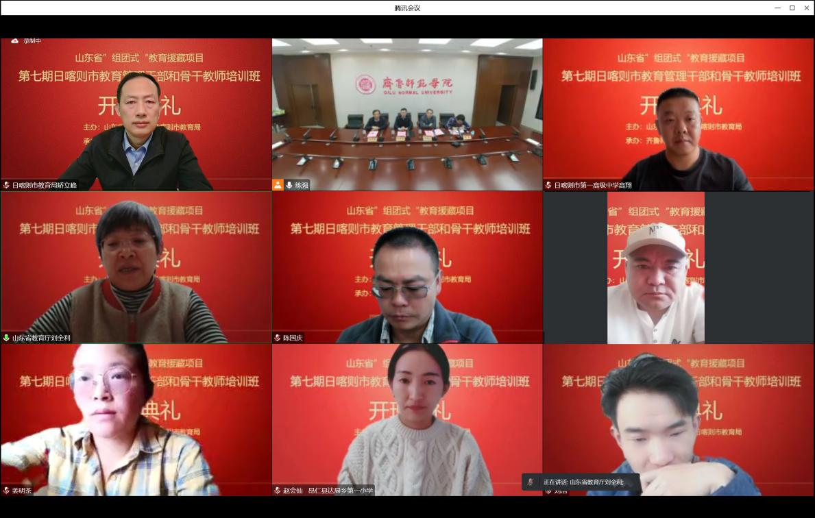 2022年10月18日,由山东省教育厅、日喀则市教育局主办,齐鲁师范学院承办的山东省“组团式”教育人才援藏项目第七期日喀则市教育管理干部和骨干教师培训班在线上开班。齐鲁师范学院党委书记林松柏,山东省教育厅教师工作处二级调研员刘全利,山东省第十批援藏干部、日喀则市教育局党组成员、副局长矫立峰等领导出席开班典礼。典礼由教师教育学院院长毕诗文主持。
