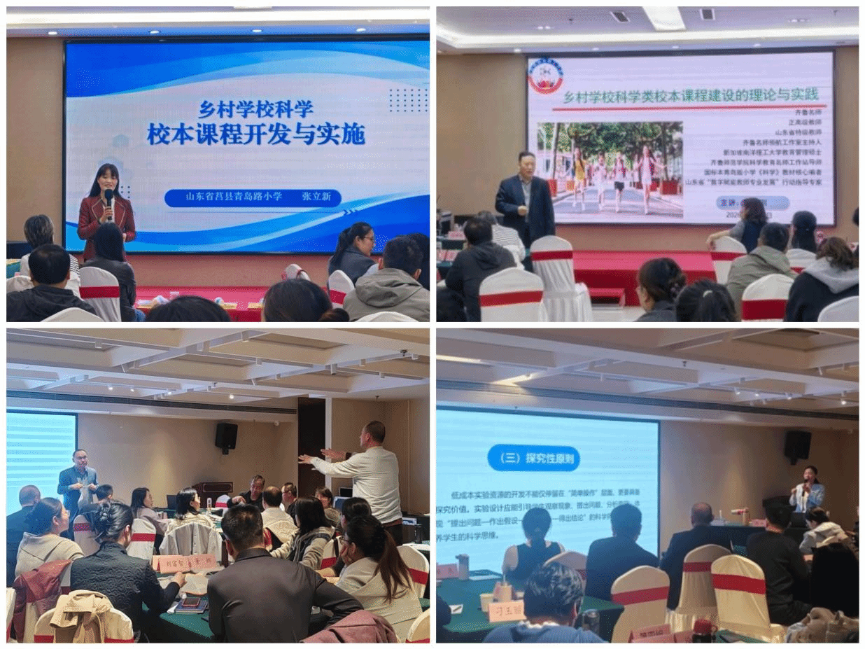 本次活动共邀请5名专家,全部为深耕小学科学一线的齐鲁名师、特级教师。山东省特级教师高霞作了《基于课本的项目化学习开发与实施》专题报告,围绕现行小学科学教材,系统阐释低成本实验开发的原则、路径与技巧,重点强调依托生活废旧材料,实现实验教学的生活化、安全性与探究性,为乡村学校破解实验资源不足难题提供了可操作的解决方案。随后,齐鲁名师、特级教师范明刚聚焦《乡村学校科学校本课程建设的理论与实践》,为参训教师厘清校本课程开发的理论框架、核心要素与多元路径,引导教师立足乡村实际,打造具有本土特色的科学课程体系。