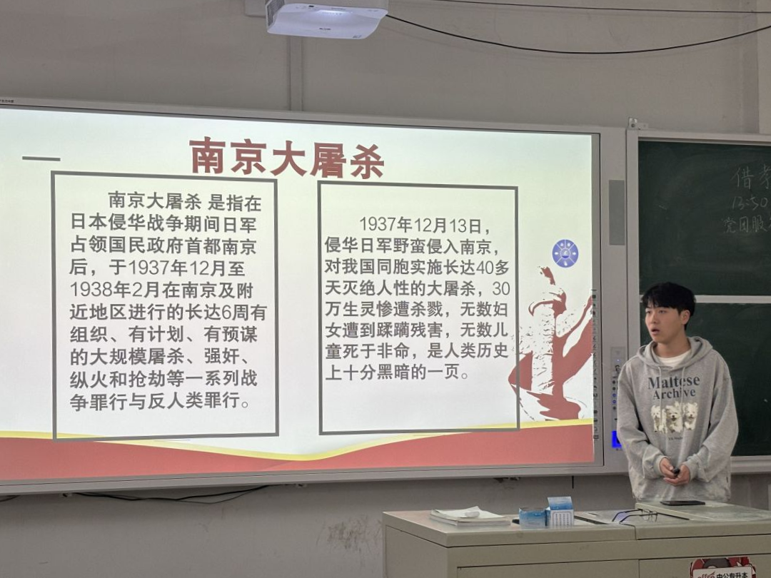 为缅怀烈士功绩,弘扬烈士精神,不忘南京之痛,缅怀华夏之殇,增强吾辈爱国情怀和民族自豪感,12月14日13:50我院于二教A102举办了以“前事不忘后事之师,以史为鉴开创未来”主题党日活动。我院入党积极分子参加本次活动。