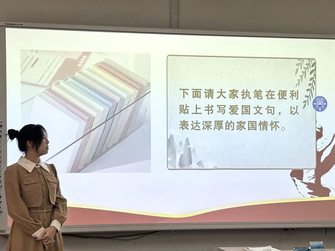 随后,他们在和平鸽以及书签卡上书写爱国文字。制作好的和平鸽和书签卡被粘到栏板上,用激扬的文字表达了对祖国美好的祝愿。