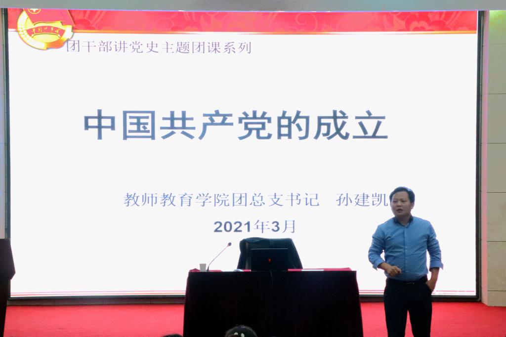 为学习贯彻习近平总书记在党史学习教育动员大会上的重要讲话精神,在全校团员青年中迅速掀起“学党史、强信念、跟党走”的学习热潮,依据中央统一部署,遵照校团委的相关要求,3月25日下午,教师教育学院在图书馆报告厅组织开展党史主题团课系列活动,由团总支书记孙建凯主讲,各年级的青年团员共同聆听。