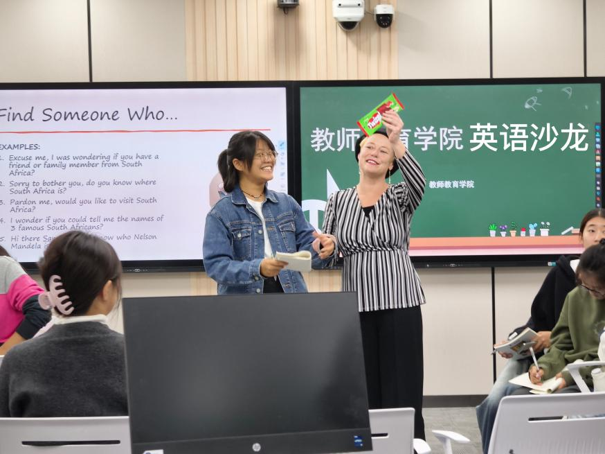本次英语沙龙围绕“彩虹之国——南非的地理位置与风土人情”话题展开。活动前同学们都进行了认真准备,在外教的精心组织下,来自教师教育学院小学教育专业、心理学专业、社会工作专业和科学教育等专业的学生们积极参与,活动现场气氛热烈。沙龙开始,Rita以五个有关南非的小问题引入主题,语气亲切随和,学生们积极思考,课堂氛围活跃。外教运用风趣的语言以及灵动的肢体动作,颇为风趣地讲述了自己在南非求学的个人经历,分享了南非高等教育的课程设置、学术氛围以及师生互动的场景,在欢声笑语中,学生们也主动运用所学英语知识与外教就中国的大学教育、齐鲁文化、君子文化等方面展开了热烈的互动交流。学生们积极讨论,老师热情回应,课堂气氛愈发活跃,笑声不断。