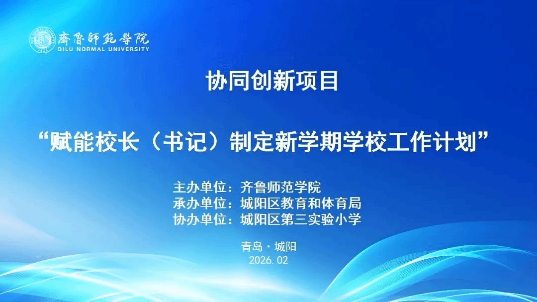 2026年是国家“十五五”规划开局之年,更是教育强国建设的关键之年。为助力协同创新项目学校校长(书记)精准把握教育发展方向,科学制定新学期学校工作计划,推动教育教学工作提质增效,2月25日,齐鲁师范学院教师教育学院与基础教育研究院联合举办的协同创新“赋能校长(书记)制定新学期学校工作计划”培训活动在青岛市城阳区第三实验小学正式拉开帷幕。本次培训以“校长硬核领导力修炼—如何制定新学期工作计划与配档”为核心主题。活动汇聚了青岛城阳各项目学校的教育管理者,通过线上线下融合、导师指导与自主研修结合、答辩验收闭环的模式,旨在推动优质教育资源共建共享,赋能区域教育协同发展。