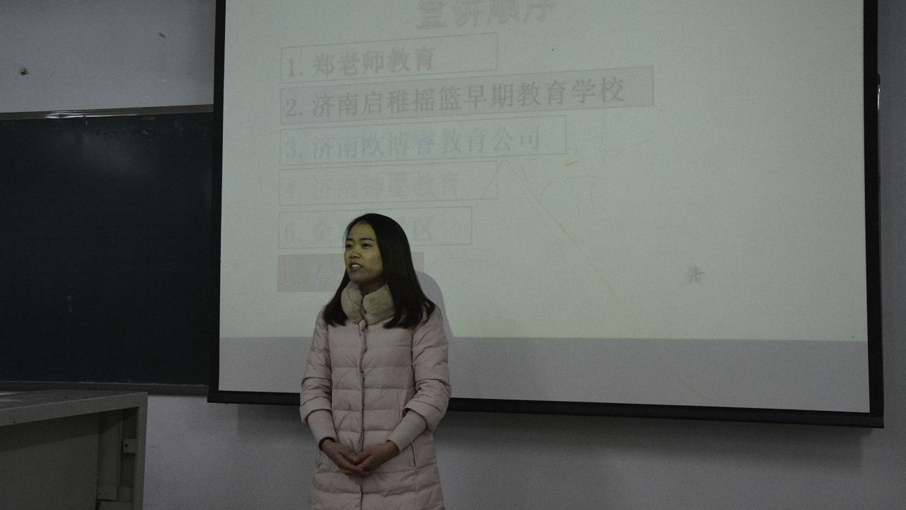 郑老师教育做最先介绍,机构1999年培训开始至今,培养了一批优秀中小学教师,在2014年开设对幼儿园教师培养、注重学前以及幼小衔接,更计划在2017年开设国际园和多家阳光课堂,为有能力的人提供平台。其次由济南启稚教育摇篮早期学校做介绍,该学校作为国家4A级教育机构,在过去8年的历史中,培养出一批批优秀人才,倡导与高人同行,与智者为伍。济南欧博睿教育公司则注重教育理念的培养,教育系统的完善,在心理健康方面有很深刻的研究。神墨教育提倡因材施教,激发潜能,课程方面包括珠心算、口才、趣秒练字、绘画等,优厚的工作待遇吸引很多学生慕名而来。金象山旅游机构则在寒暑假为学生提供了实践机会。山东泰岳教育咨询有限公司提出,“比之一个公司,我们更想给你一个施展自我的平台。比之一份工作,我们更想给你一个适合自己的职业规划。比之一个职位,我们更想给你一个不断充电的学习机会。比之一个座位,我们更想给你一个释放年轻的团队氛围。”