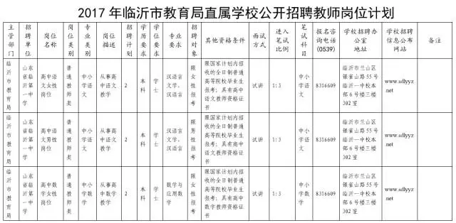 3、进入笔试范围人员参加2017年临沂市教育局直属学校公开招聘教师笔试,根据面试和笔试综合成绩确定进入考察体检范围人员。