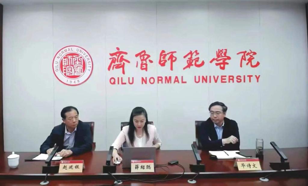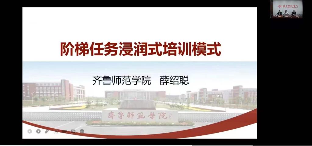教师教育学院院长毕诗文、执行院长赵延银出席会议,薛绍聪副教授代表教师教育学院进行项目经验汇报,汇报主题为“阶梯任务浸润式”培训模式,介绍齐鲁师范学院国培小学班主任培训承办情况及典型经验,提出了指向自主选择、个性化发展、信息化支持的专业化培训模式创新。教师教育学院“国培计划”骨干班主任项目始终坚持成果导向理念,持续不断地推进教师培训的数字化转型和精准培训改革。