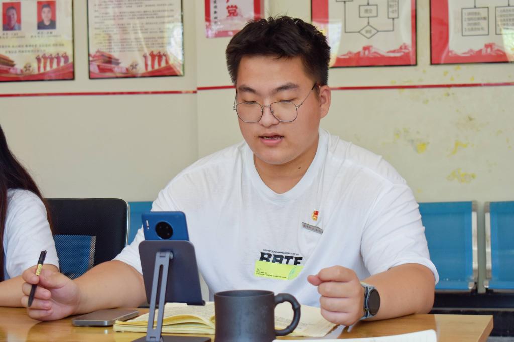 鲁曜服务队队长王国威进行发言,他从近期的“三下乡”工作中分享感悟,队员们在这骄阳似火的季节里留下了美好和深刻的回忆,去开展送教、普通话推广、走访等活动,与当地的居民融合在一起,看到孩子与老人脸上洋溢的最真实的笑容,任何辛苦仿佛都被抛在了九霄云外,真正的体会到了有味道,有底蕴,有激情,有红色的三下乡。