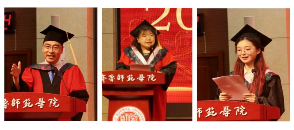 毕业典礼在庄严的国歌声中拉开序幕。学院团总支书记李炜琛、副书记王亚东作为2019级辅导员老师,带着满满的牵挂,向毕业生们送上深情祝福。师恩厚重,母校情深。2019级小学教育公费师范生班王浩霖作为毕业生代表发言,对学院和老师四年的培养与教导表达了衷心的感谢,并表示,未来将时刻牢记“博学明道崇德象贤”的校训,践行“学而不厌诲人不倦”的院训,不忘初心、砥砺奋进。
