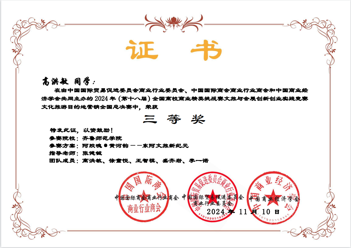2024年11月,在第十八届全国高校商业精英挑战赛文旅与会展创新创业实践竞赛全国总决赛中,教师教育学院高洪敏团队从众多支参赛队伍中脱颖而出,在全国决赛中斩获三等奖,展示了他们在商业创意和实战操作中的非凡能力。这一成绩的取得不仅彰显了教院学子在电子商务领域的创新精神和实践能力,也为学院赢得了广泛的社会关注和赞誉。